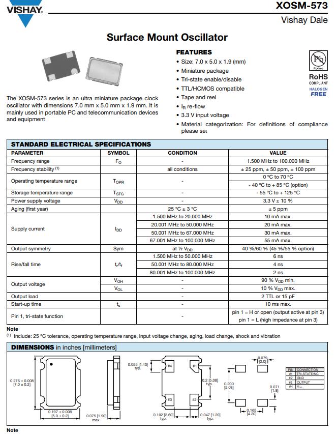 | XOSM-573 Series 50 MHz 7 x 5 mm 5 V ±100 ppm Surface Mount Clock Oscillator | |||||
