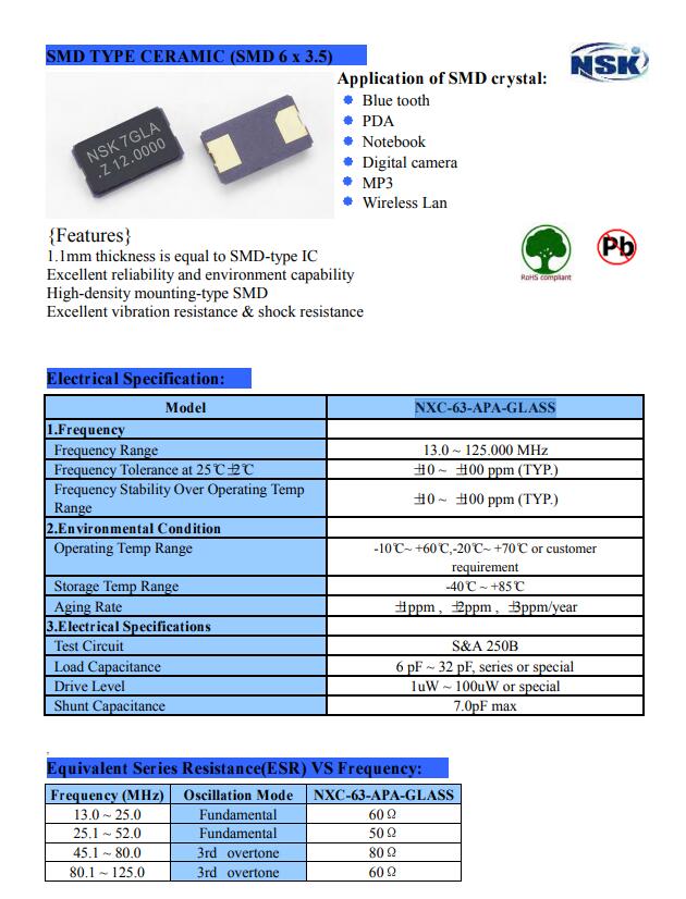 津綻晶振,NXC-63-APA-GLASS晶振,6035二腳晶振貼片晶振本身體積小,超薄型石英晶體諧振器,特別適用于有目前高速發展的高端電子數碼產品,因為晶振本身小型化需求的市場領域,小型?薄型是對應陶瓷諧振器(偏差大)和普通的石英晶體諧振器(偏差小)的中間領域的一種性價比較出色的產品.產品廣泛用于筆記本電腦,無線電話,衛星導航HDD, SSD, USB, Blu-ray等用途,符合無鉛焊接的高溫回流焊曲線特性.